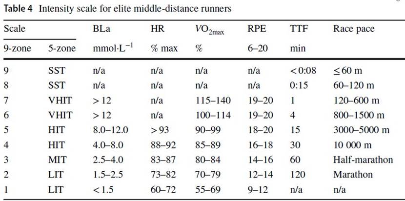 3. 次最大 (低於最大有氧速度) 的跑步訓練,例如節奏跑 (兩個閾值間) 或是最大乳酸穩定點的訓練可以訓練清除氫離子的能力,並運用乳酸作為能量等等,或許可以幫助zone6的區間的運動至力竭時間更延長 (撐更久),那麼在中距離項目的表現也可能受益於這個區間的訓練。